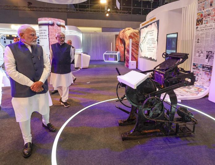 **EDS: THIRD PARTY IMAGE** In this image posted by @narendramodi via X on May 1, 2025, Prime Minister Narendra Modi and Maharashtra Governor CP Radhakrishnan at the Bharat Pavilion during the World Audio Visual and Entertainment Summit (WAVES) 2025, in Mumbai. (@narendramodi on X via PTI Photo) (PTI05_01_2025_000396B) *** Local Caption ***