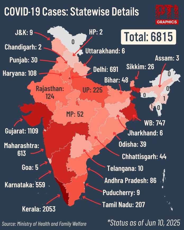 PTI INFOGRAPHICS | India's COVID-19 case count reaches 6,815. Kerala reports the highest number with 2,053 cases, followed by Gujarat (1,109) and West Bengal (747). Here's a state-wise breakdown of active COVID-19 cases as of June 10, 2025. PTI GRAPHICS.(PTI06_10_2025_001010009B)