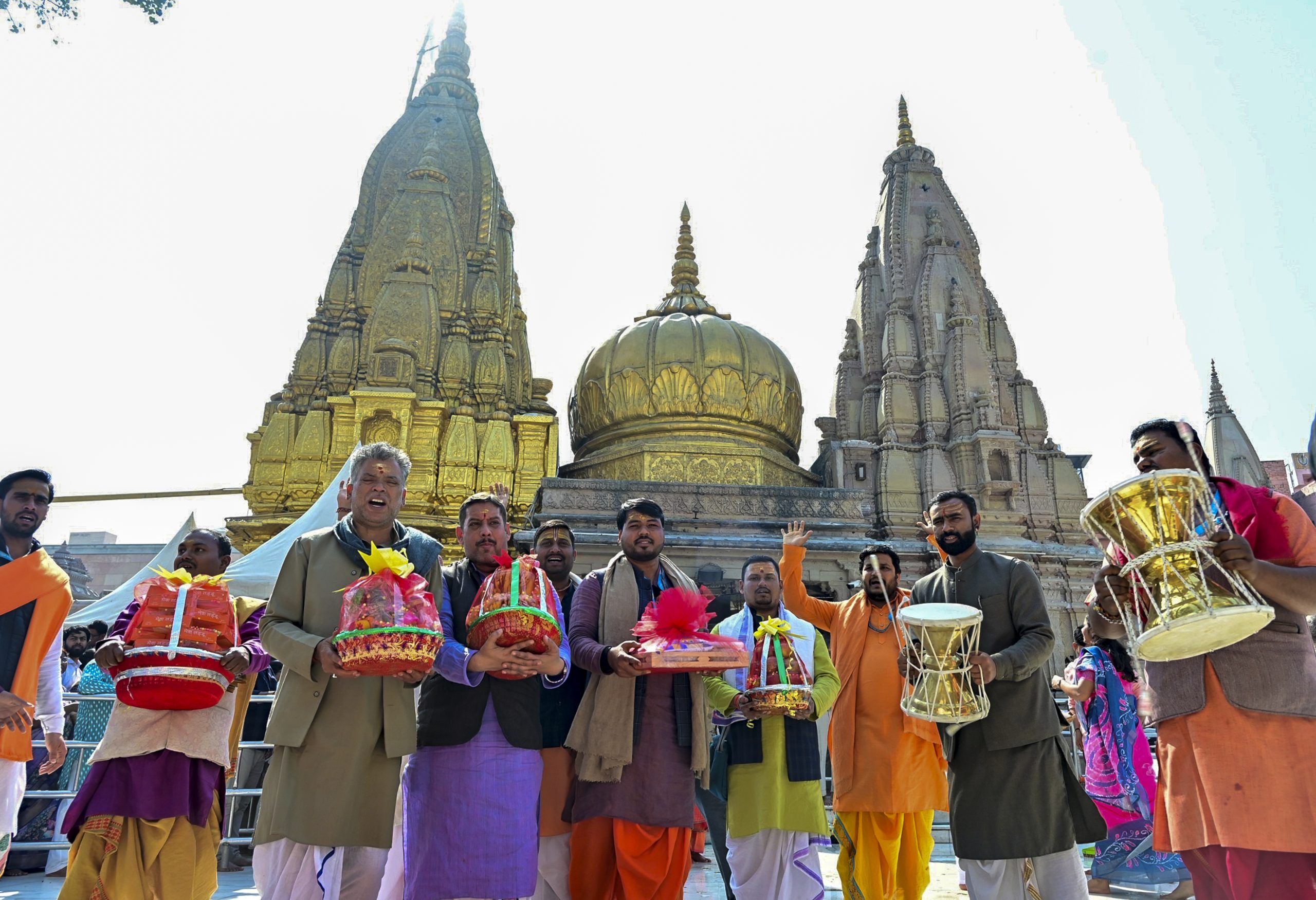 Varanasi: People carrying offerings, including clothes, ornaments, fruits, and sweets, from Shri Krishna Janmasthan in Mathura for Baba Vishwanath and Mata Parvati, arrive at the Kashi Vishwanath Temple ahead of the 'Mahashivratri' festival, in Varanasi, Monday, Feb. 9, 2026. (PTI Photo)(PTI02_09_2026_000473B)