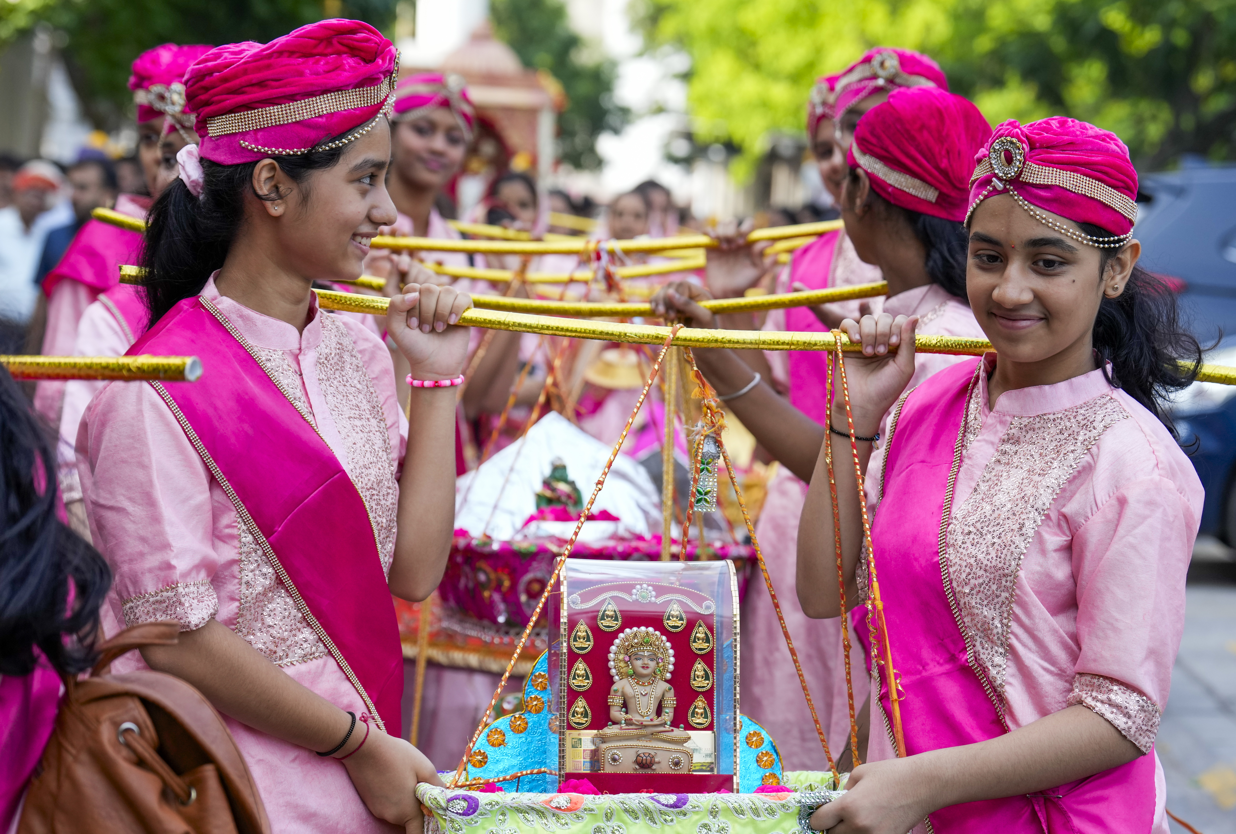 Chennai: Devotees take part in a religious procession on the occasion of Mahavir Jayanti, in Chennai, Thursday, April 10, 2025. (PTI Photo/R Senthilkumar)(PTI04_10_2025_000066B)