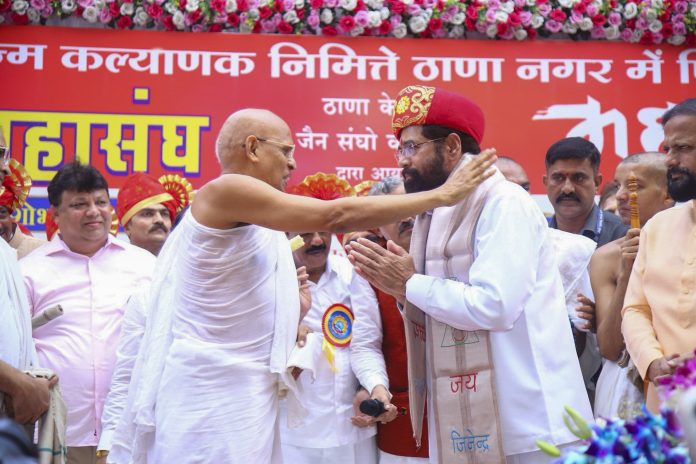 **EDS: THIRD PARTY IMAGE** In this image released by @mieknathshinde via X on April 10, 2025, Maharashtra Deputy Chief Minister Eknath Shinde during the ‘Bhagwan Mahavir Swami Janma Kalyan Mahotsav’ organized by Thane Jain Federation on the occasion of Mahavir Jayanti. (@mieknathshinde on X via PTI Photo)(PTI04_10_2025_000068B)