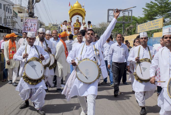 Gurugram: Artists play traditional instruments during a procession on the occasion of Mahavir Jayanti, in Gurugram, Tuesday, March 31, 2026. (PTI Photo)(PTI03_31_2026_000219B)