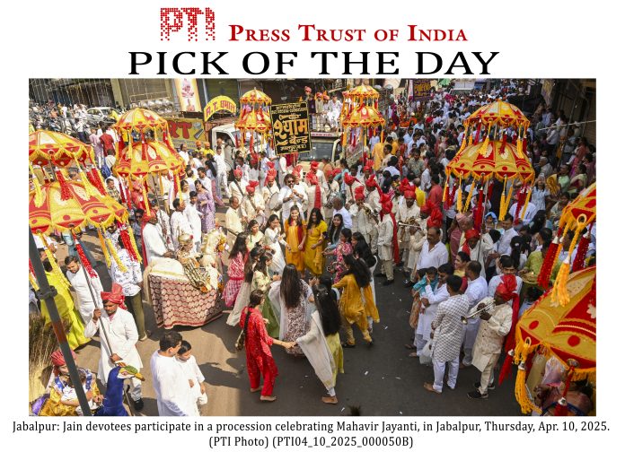 PLS TAKE NOTE OF THIS PTI PICK OF THE DAY::: Jabalpur: Jain devotees participate in a procession celebrating Mahavir Jayanti, in Jabalpur, Thursday, Apr. 10, 2025. (PTI Photo) (PTI04_10_2025_000050B)(PTI04_10_2025_000269B)