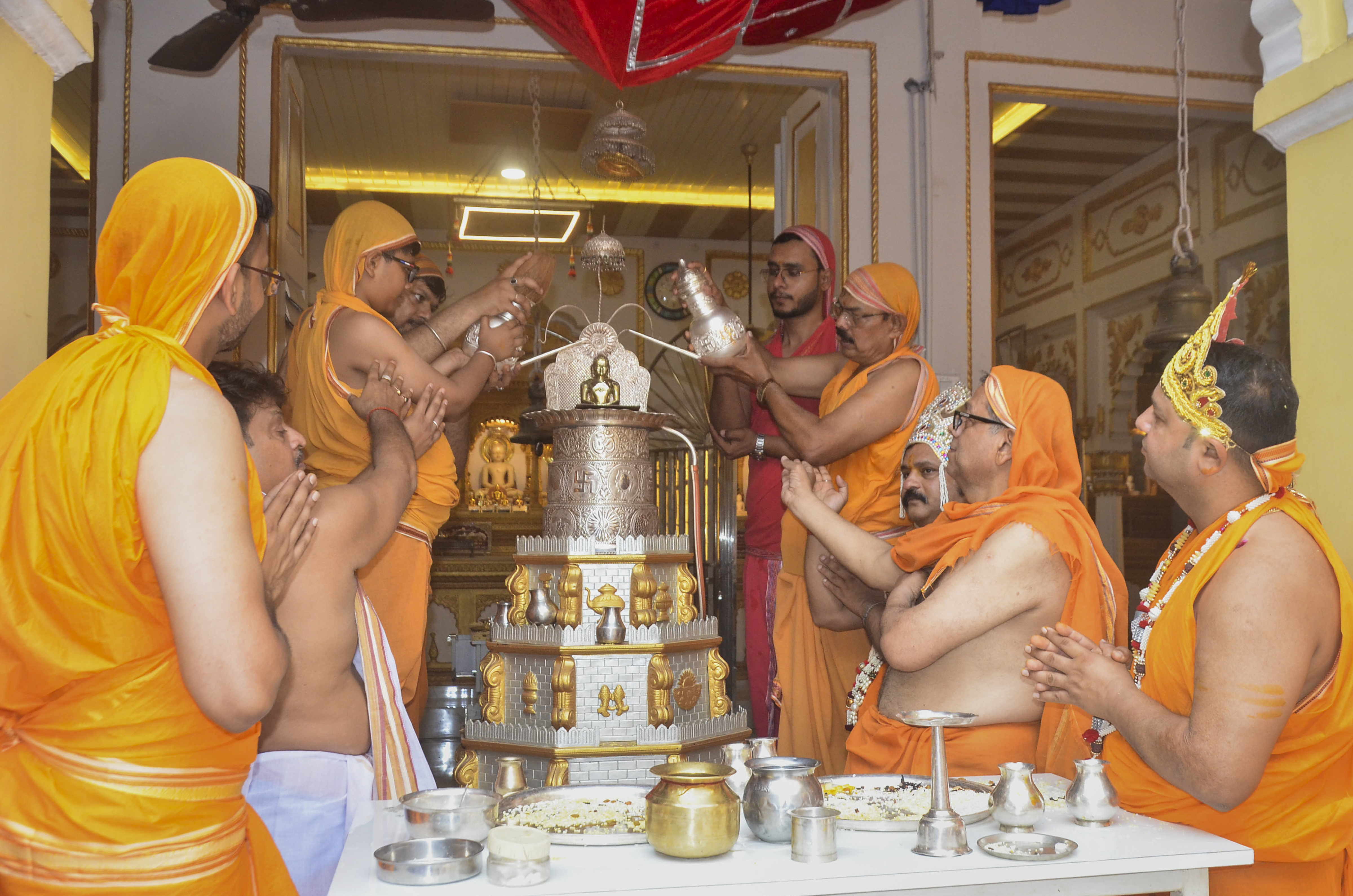 Mirzapur: Jain devotees perform 'Jalabhishek' of Lord Mahavir at the temple on the occasion of Mahavir Jayanti, in Mirzapur, Thursday, Apr. 10, 2025. (PTI Photo) (PTI04_10_2025_000058B)