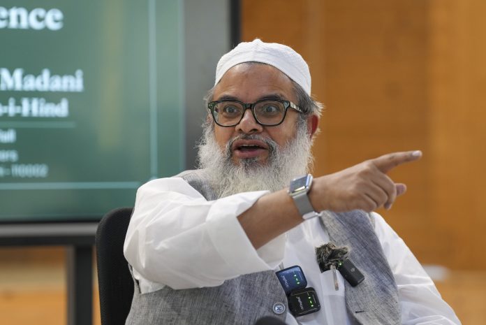 New Delhi: Jamiat Ulema-e-Hind President Maulana Mahmood Madani addresses a press conference regarding the Waqf (Amendment) Act, 2025, in New Delhi, Sunday, April 13, 2025. (PTI Photo/Shahbaz Khan)(PTI04_13_2025_000200B)