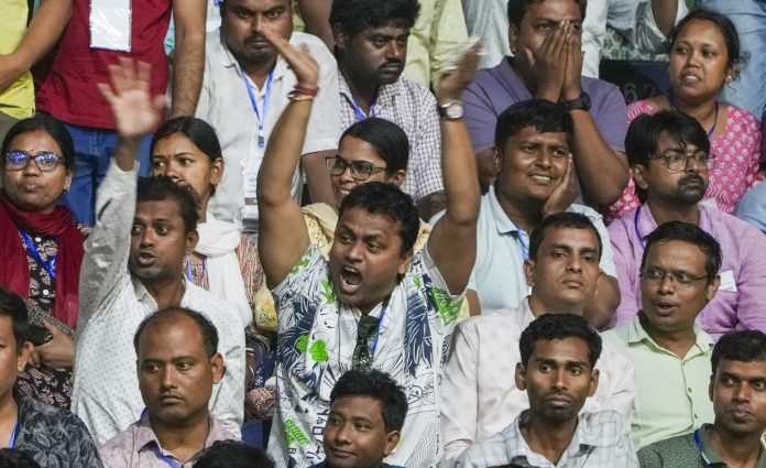 Kolkata: Teachers, who lost their jobs after a Supreme Court verdict invalidated the appointment of 25,753 teachers and other staff in state-run and state-aided schools in West Bengal, react during an interaction with West Bengal Chief Minister Mamata Banerjee, at Netaji Indoor Stadium, in Kolkata, Monday, April 7, 2025. (PTI Photo/Swapan Mahapatra)(PTI04_07_2025_000124B)
