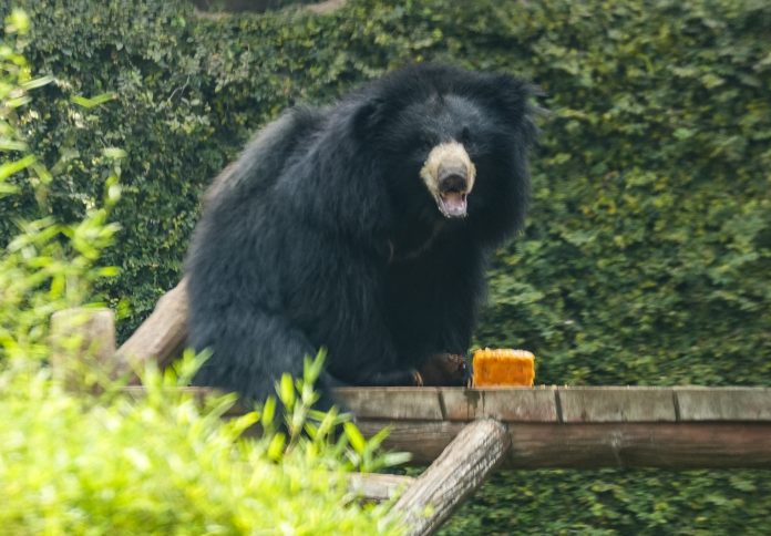 Mumbai: A bear inside its enclosure at the Byculla Zoo, in Mumbai, Sunday, April 27, 2025. In the extreme heat condition this summer, zookeepers are taking various steps including water fountains and increased shade to mitigate the impact of extreme heat on zoo animals. (PTI Photo/Kunal Patil)(PTI04_27_2025_000116B)