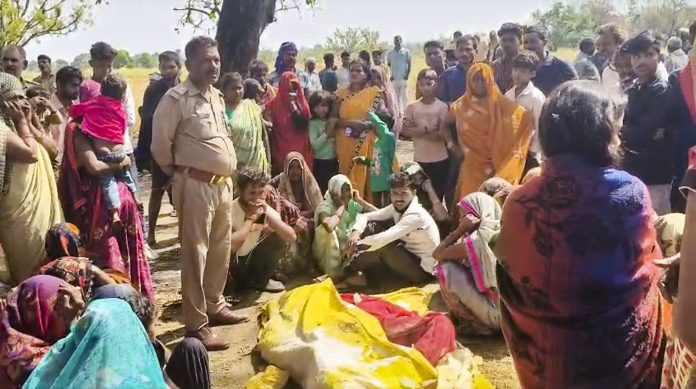 **EDS: SCREENGRAB** Prayagraj: People sit near the mortal remains of a man who was killed at Karchana area, in Prayagraj district, Uttar Pradesh, Sunday, April 13, 2025. A 35-year-old man was killed in a village over some old enmity and an attempt was made to burn his body, a police officer said on Sunday. (PTI Photo) (PTI04_13_2025_000364B)