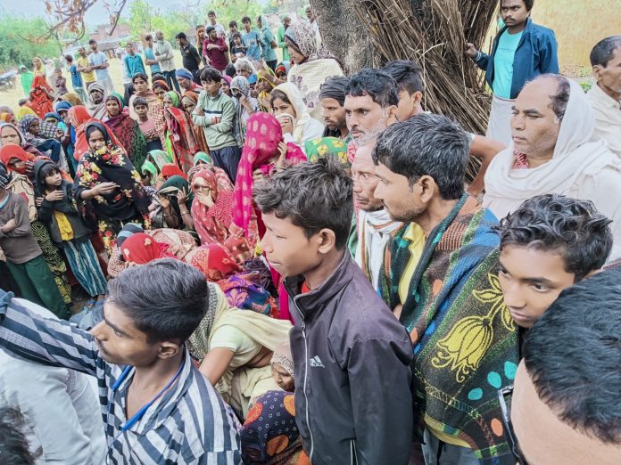 Prayagraj: People gather after a man was killed at Karchana area, in Prayagraj district, Uttar Pradesh, Sunday, April 13, 2025. A 35-year-old man was killed in a village over some old enmity and an attempt was made to burn his body, a police officer said on Sunday. (PTI Photo) (PTI04_13_2025_000392B)