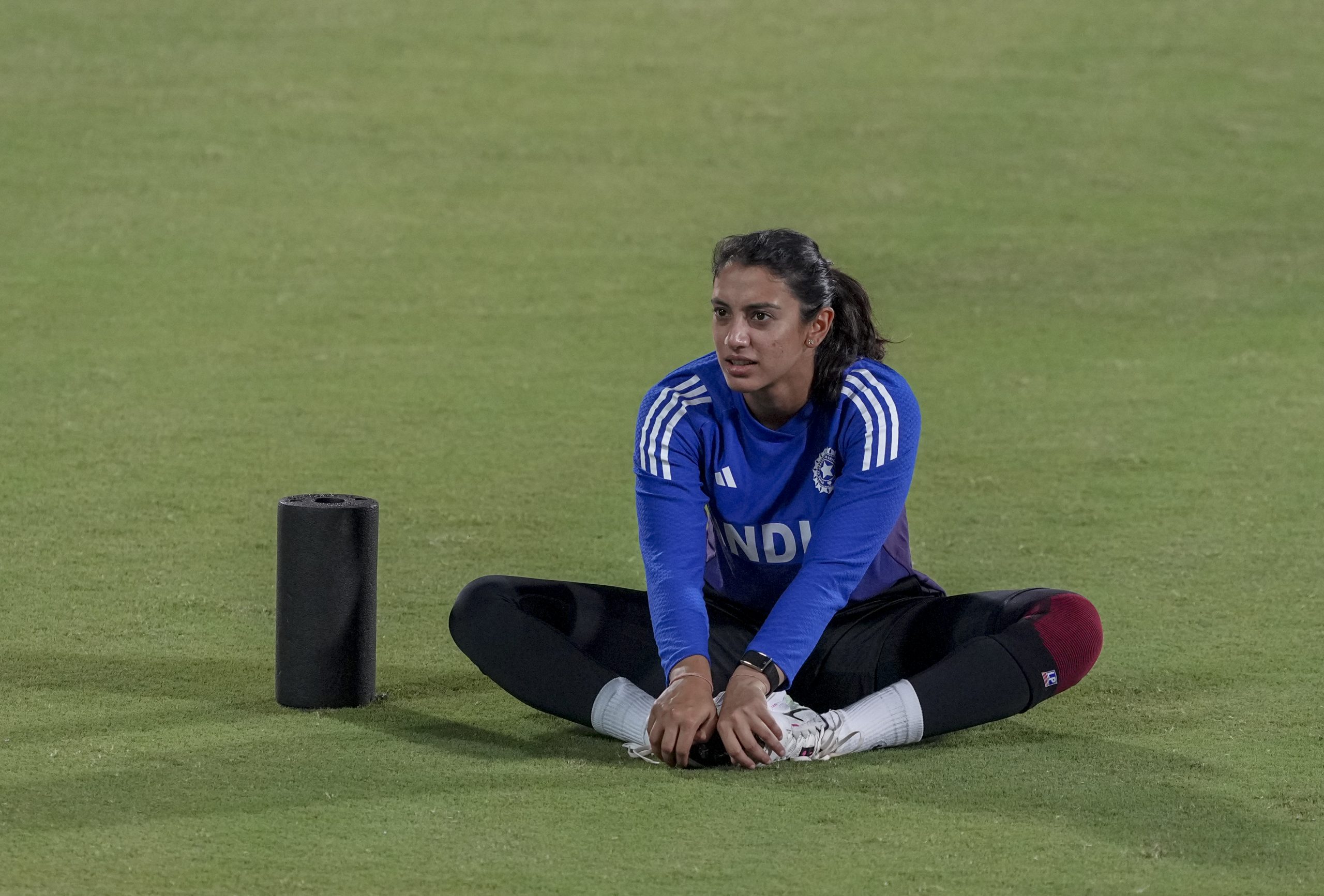 Guwahati: India's Smriti Mandhana stretches during a training session ahead of the ICC Women's Cricket World Cup 2025 match between India and Sri Lanka, at ACA Stadium, Barsapara, in Guwahati, Monday, Sept. 29, 2025. (PTI Photo/Swapan Mahapatra)(PTI09_29_2025_000375B)
