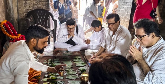 Haridwar: Relatives perform rituals during immersion of legendary actor Manoj Kumar’s ashes in the Ganges, at Haridwar’s Har Ki Pauri, Saturday, April 12, 2025. (PTI Photo) (PTI04_12_2025_000092B)