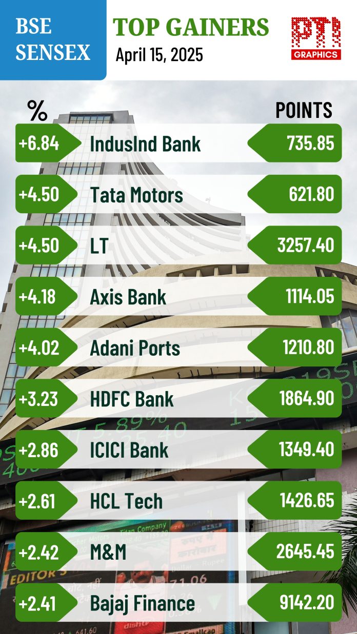 Rallying for the second straight session on Tuesday, the BSE benchmark jumped 1,577.63 points or 2.10 per cent to settle at 76,734.89. The Nifty surged 500 points or 2.19 per cent to 23,328.55. PTI SUM HVA