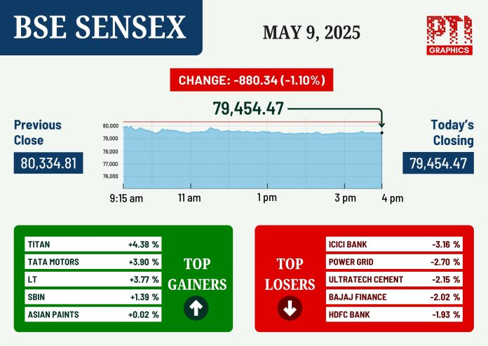 Extending its previous day’s decline, the 30-share BSE benchmark gauge tanked 880.34 points or 1.10 per cent to settle at 79,454.47, in a largely range-bound trading.