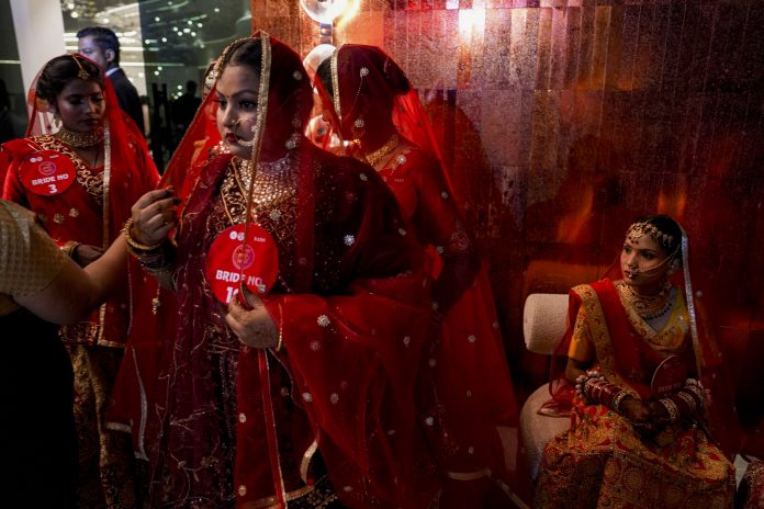 New Delhi: Brides get ready during a mass marriage ceremony organised by Ladli Foundation Trust and AvdheshanandG Mission, at the Jawaharlal Nehru (JLN) Stadium, in New Delhi, Sunday, March 30, 2026. (PTI Photo/Arun Sharma) (PTI03_30_2026_000404B) *** Local Caption ***