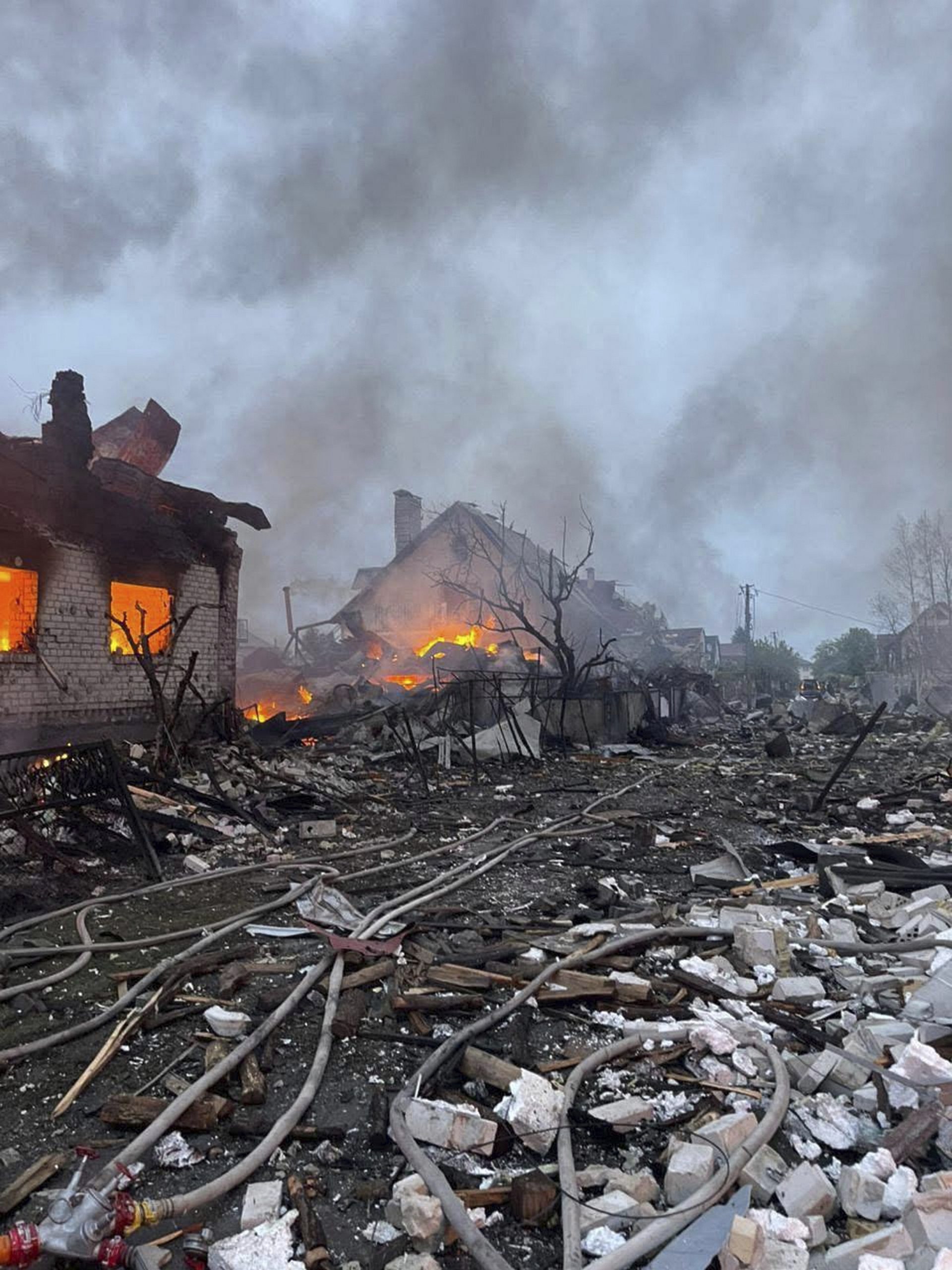 Fires broke out in homes and businesses, set off by falling drone debris.