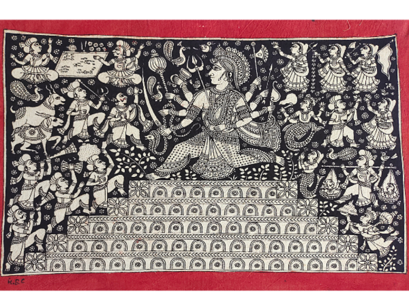 - Symbolic motifs: central depictions of the goddess surrounded by animals, celestial bodies, floral designs, and narrative panels that signify cosmic and folk elements.
