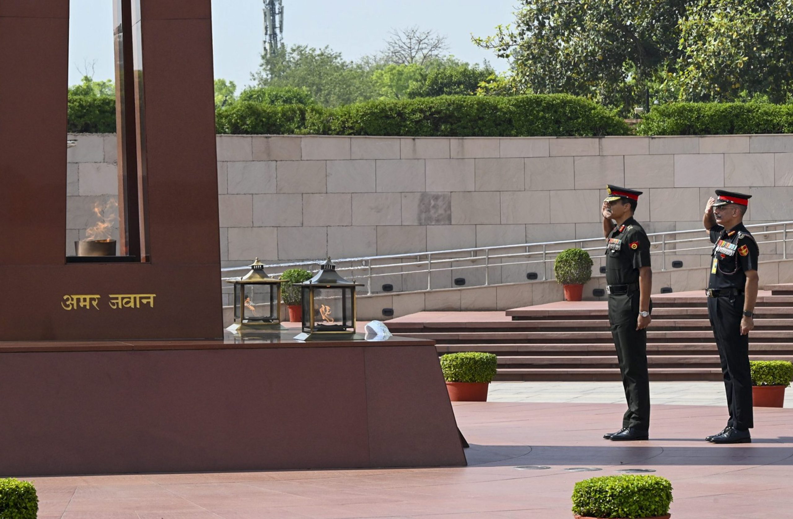 **EDS: THIRD PARTY IMAGE** In this image posted on April 2, 2026, Mechanised Infantry Regiment Additional Director General (ADG) Major General R Premraj along with a serving personnel pays tribute to the bravehearts during the 47th Raising Day celebrations, at National War Memorial, New Delhi. (@adgpi/X via PTI Photo)(PTI04_02_2026_000146B)