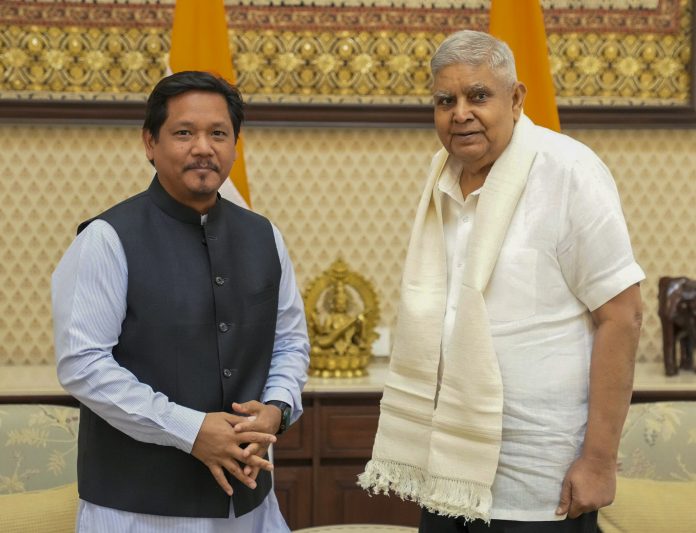 **EDS: THIRD PARTY IMAGE** In this image released by @SangmaConrad via X on April 22, 2025, Vice President Jagdeep Dhankhar with Meghalaya Chief Minister Conrad K Sangma during a meeting. (@SangmaConrad on X via PTI Photo)(PTI04_22_2025_000271B)