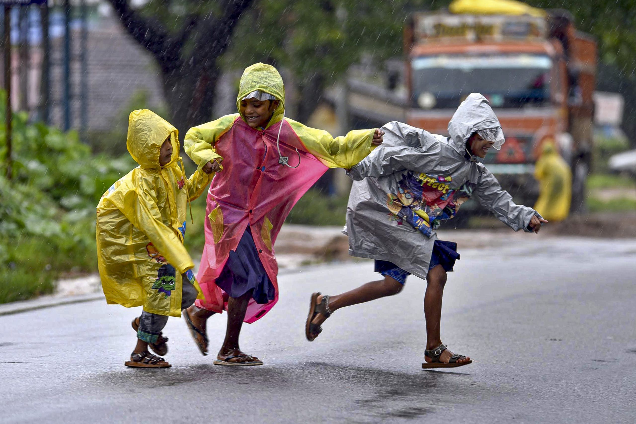 Chikkamagaluru: School children on a rainy day, in Chikkamagaluru, Karnataka, Friday, July 25, 2025. (PTI Photo) (PTI07_25_2025_000528B) *** Local Caption *** c