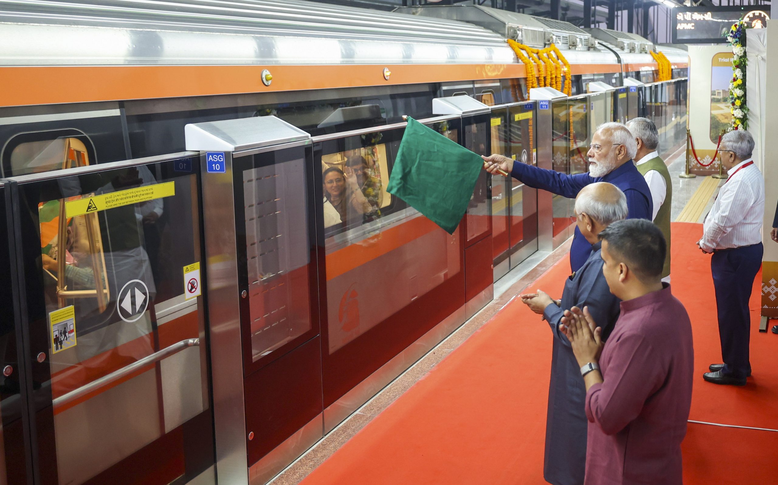 **EDS: THIRD PARTY IMAGE** In this image received on Jan. 11, 2026, Prime Minister Narendra Modi during the inauguration of the remaining stretch of phase 2 of the Ahmedabad metro, connecting Sector 10A of Gandhinagar to the Mahatma Mandir convention centre. (PMO via PTI Photo) (PTI01_11_2026_RPT686B)