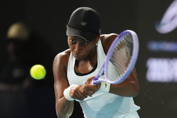 Coco Gauff returns to Belinda Bencic during a quarterfinal match at the Miami Open tennis tournament, Tuesday, March 24, 2026, in Miami Gardens, Fla. AP/PTI(AP03_25_2026_000044B)
