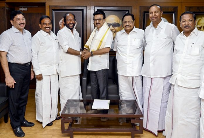 **EDS: THIRD PARTY IMAGE** In this image released by @arivalayam via X on Friday, April 11, 2025, Tamil Nadu Chief Minister and DMK chief MK Stalin during a meeting with Tiruchi Siva, who was appointed as the Deputy General Secretary of the party, in Chennai (@arivalayam via PTI Photo)
