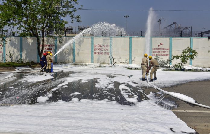 **EDS: RPT, ADDS CAPTION** Guwahati: Police personnel during a mock drill organized by Guwahati Refinery, Wednesday, March 25, 2026. (PTI Photo) (PTI03_25_2026_RPT122B)