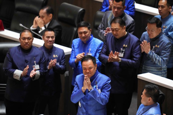 Bhumjaithai party leader Anutin Charnvirakul, center, greets lawmakers after he was elected the new prime minister, at the Parliament in Bangkok, Thailand, Thursday, March 19, 2026. AP/PTI(AP03_19_2026_000074B)