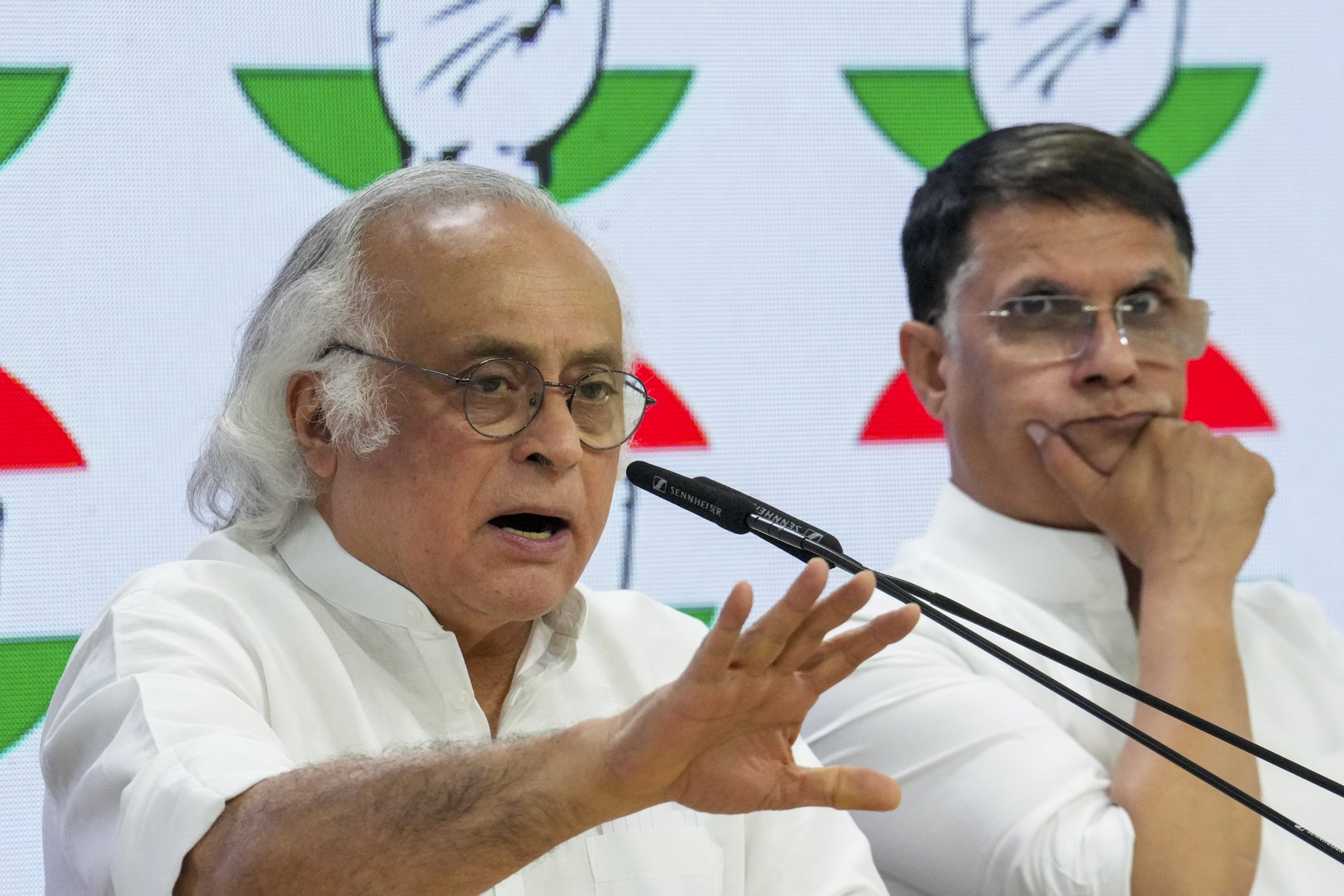 New Delhi: Congress leader Jairam Ramesh with party leader Pawan Khera addresses a press conference at the party office, in New Delhi, Wednesday, May 14, 2025. (PTI Photo/Kamal Kishore)(PTI05_14_2025_000315B)