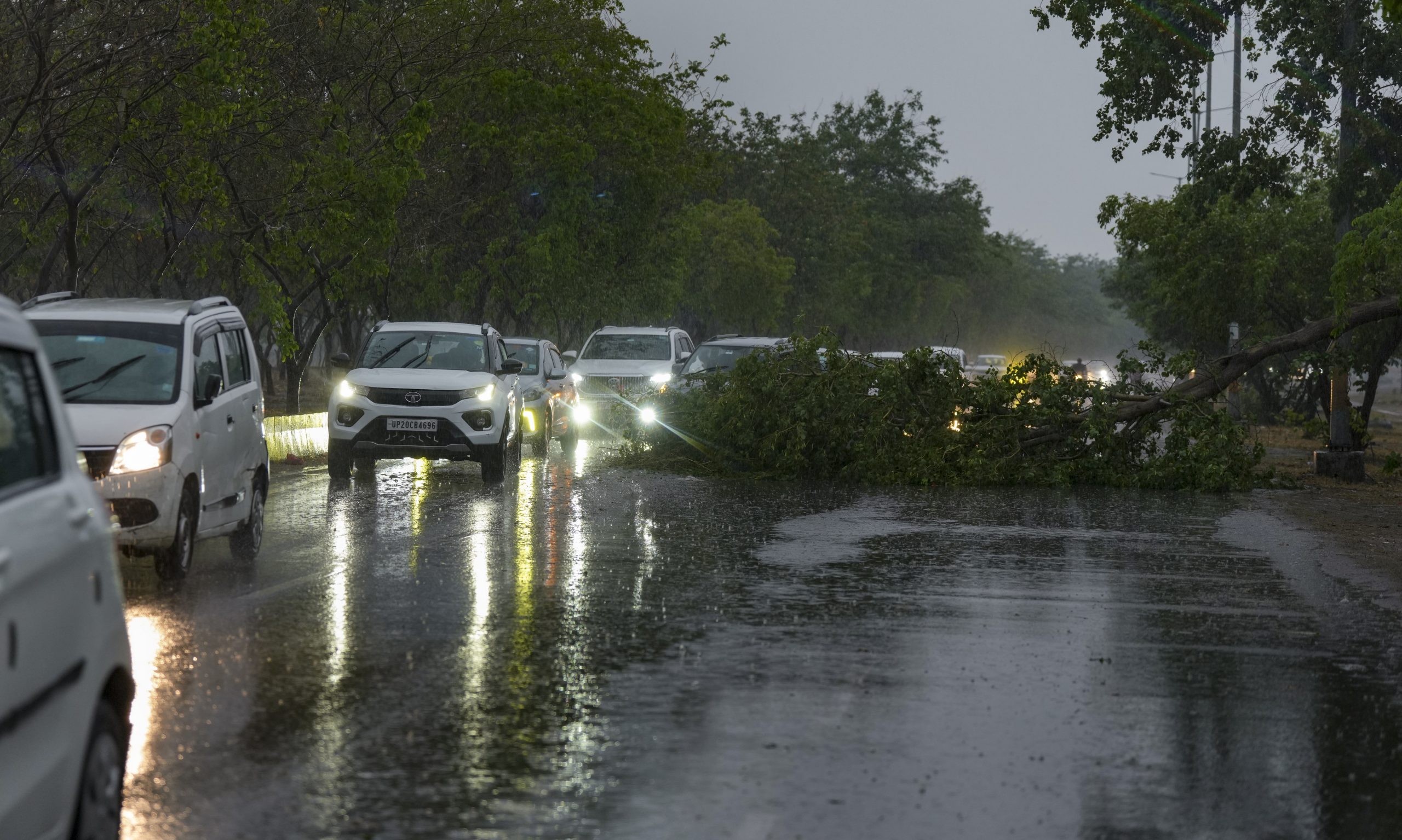 Noida: Vehicles ply on a road partially blocked by an uprooted tree after a thunderstorm and rains, in Noida, Friday, May 2, 2025. (PTI Photo/Vijay Varma) (PTI05_02_2025_000059B)