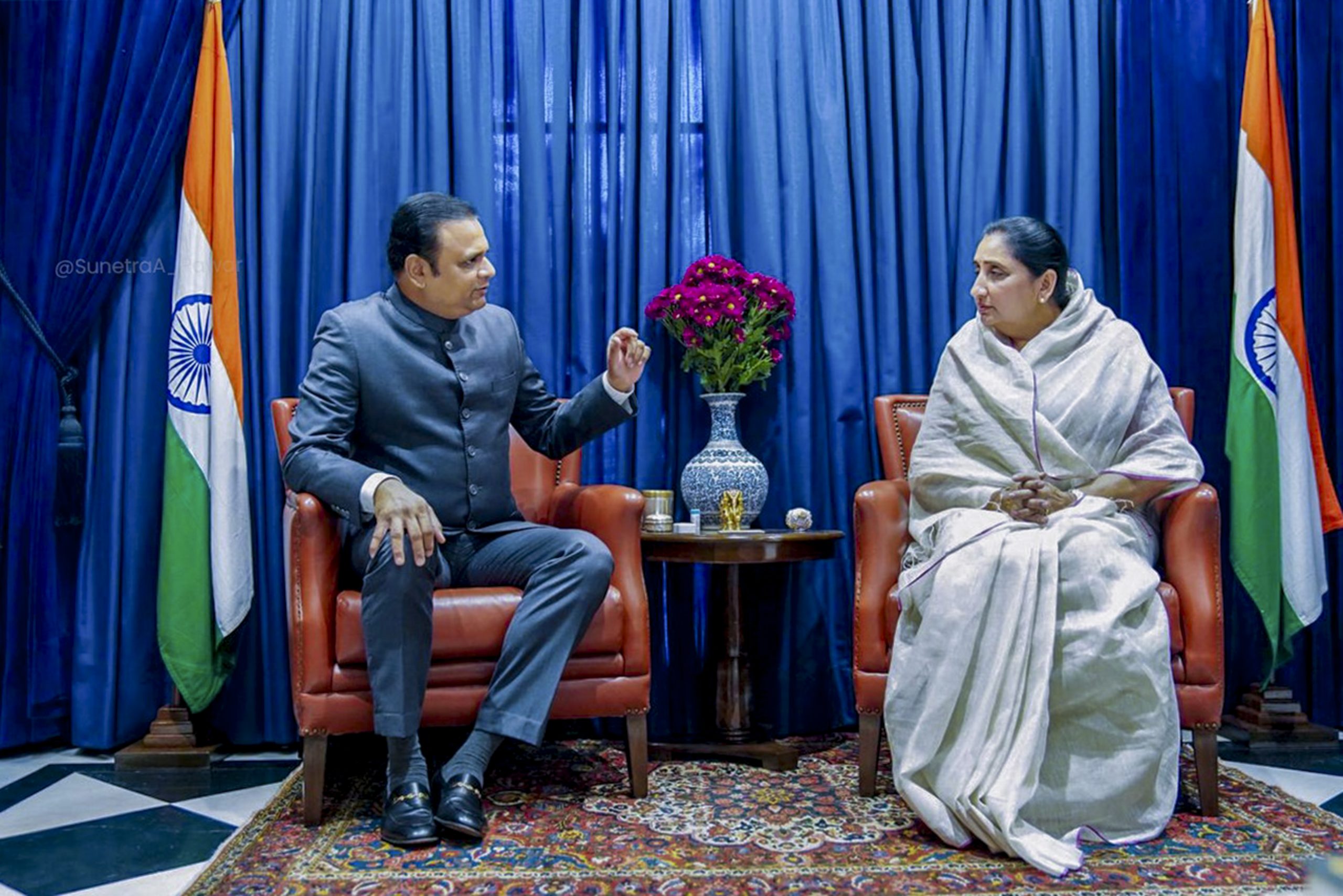 **EDS: THIRD PARTY IMAGE** In this image posted on Feb. 23, 2026, Maharashtra Deputy Chief Minister Sunetra Pawar, right, meets Legislative Assembly Speaker Rahul Narvekar, in Mumbai. (@SunetraA_Pawar/X via PTI Photo)(PTI02_23_2026_000184B)