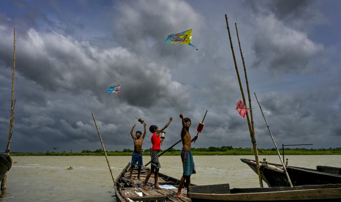 Nadia: Boys fly kites as dark monsoon clouds fill the sky as they stand on a boat on the River Hooghly in Nadia, West Bengal, Thursday, June 26, 2025. (PTI Photo) (PTI06_26_2025_000252B)