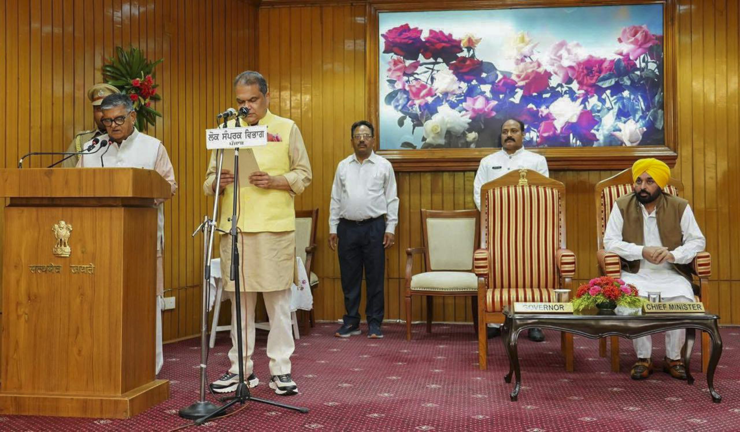 **EDS: THIRD PARTY IMAGE** In this image released by @msisodia via X on July 3, 2025, AAP leader Sanjeev Arora, who won the Ludhiana West Assembly bypoll, takes oath as a cabinet minister in Punjab. Punjab Chief Minister Bhagwant Mann is also seen. (@msisodia via PTI)(PTI07_03_2025_000286B)