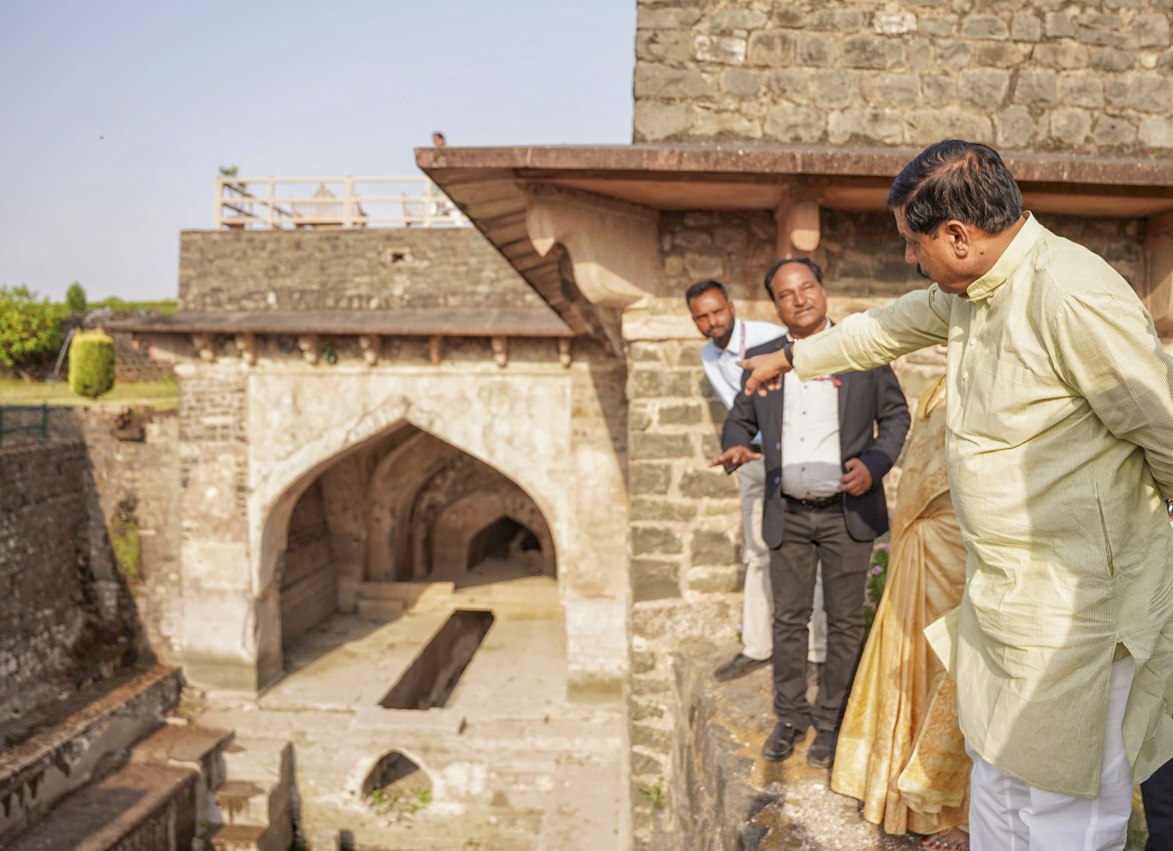**EDS: THIRD PARTY** In this image posted by @CMMadhyaPradesh via X, Thursday, Apr. 10, 2025, Madhya Pradesh Chief Minister Mohan Yadav observes the historical, cultural and architectural features of Jahaaz Mahal located at Mandu, in Dhar district. (@CMMadhyaPradesh via PTI Photo) (PTI04_10_2025_000038B)