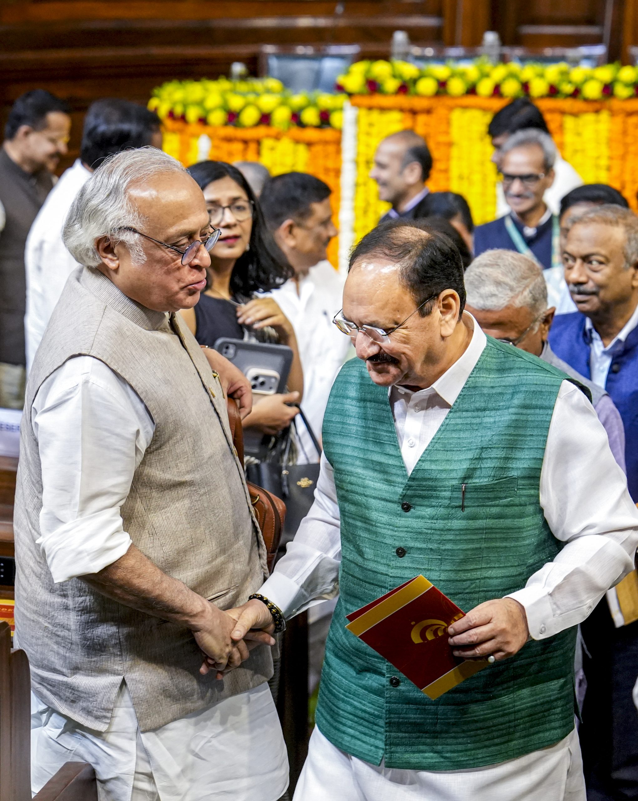 New Delhi: Union Minister JP Nadda with Congress MP Jairam Ramesh during the launch of MP Sudha Murty’s book, titled “Tides of Time”, in New Delhi, Wednesday, April 1, 2026. (PTI Photo/Salman Ali)(PTI04_01_2026_000061B)
