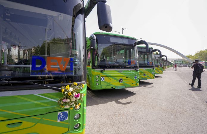 New Delhi: A fleet of electric buses ahead of the launch of D.EVi (Delhi EV Interconnector), in New Delhi, Tuesday, April 22, 2025. The launch event was cancelled due to demise of Pope Francis. (PTI Photo/Vijay Verma) (PTI04_22_2025_000055B)
