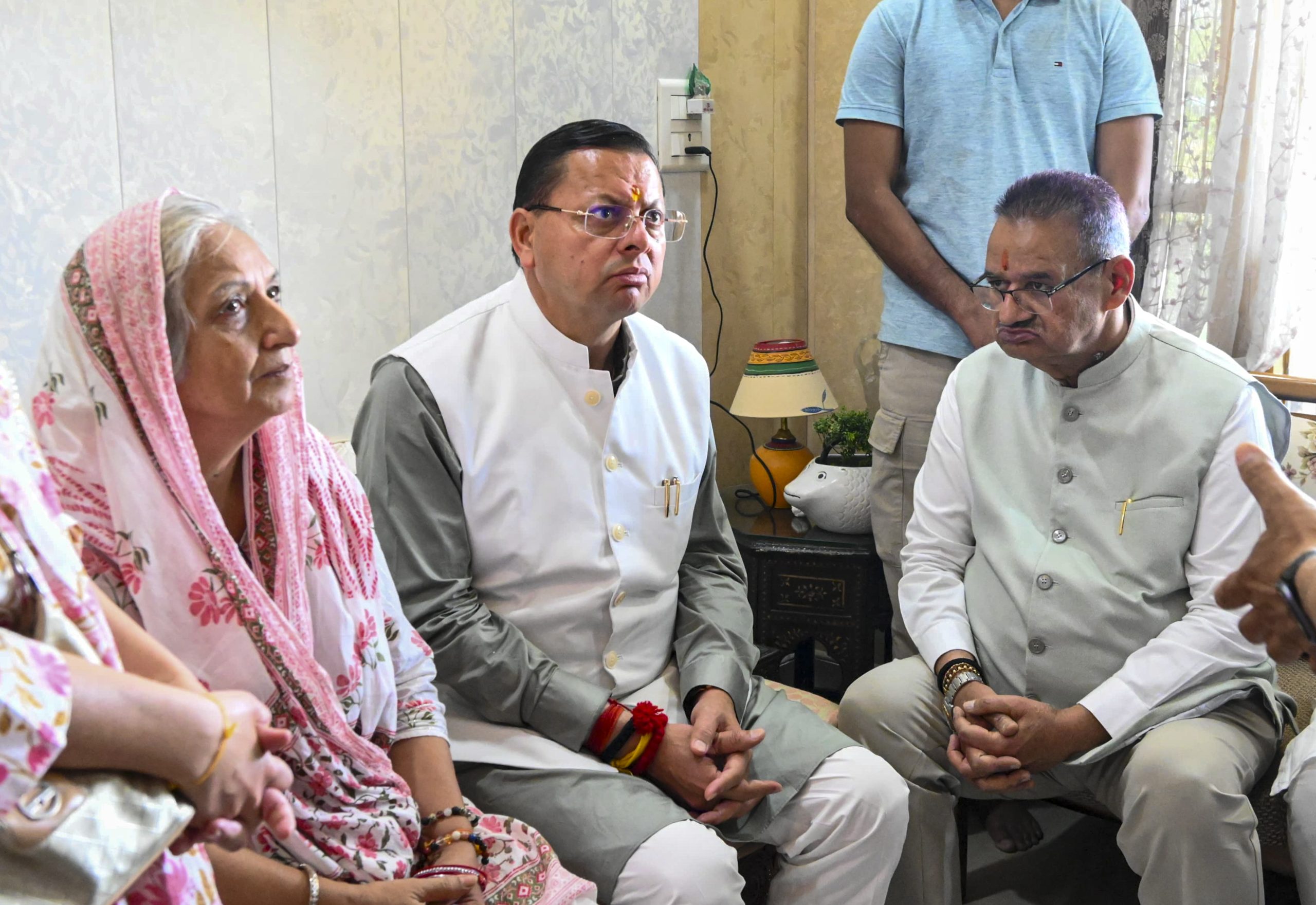 Dehradun: Uttarakhand Chief Minister Pushkar Singh Dhami meets the family members of Mukesh Joshi, a retired army brigadier, in Dehradun, Wednesday, April 1, 2026. A bullet fired by the occupants of a car involved in a road rage incident killed Joshi on Monday. (PTI Photo) (PTI04_01_2026_000543B)