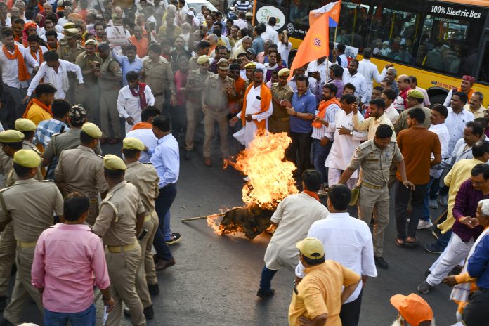 Prayagraj: Members of Vishva Hindu Parishad (VHP) and Bajrang Dal protest against the recent communal violence in West Bengal's Murshidabad, in Prayagraj, Saturday, April 19, 2025. (PTI Photo)(PTI04_19_2025_000452B)