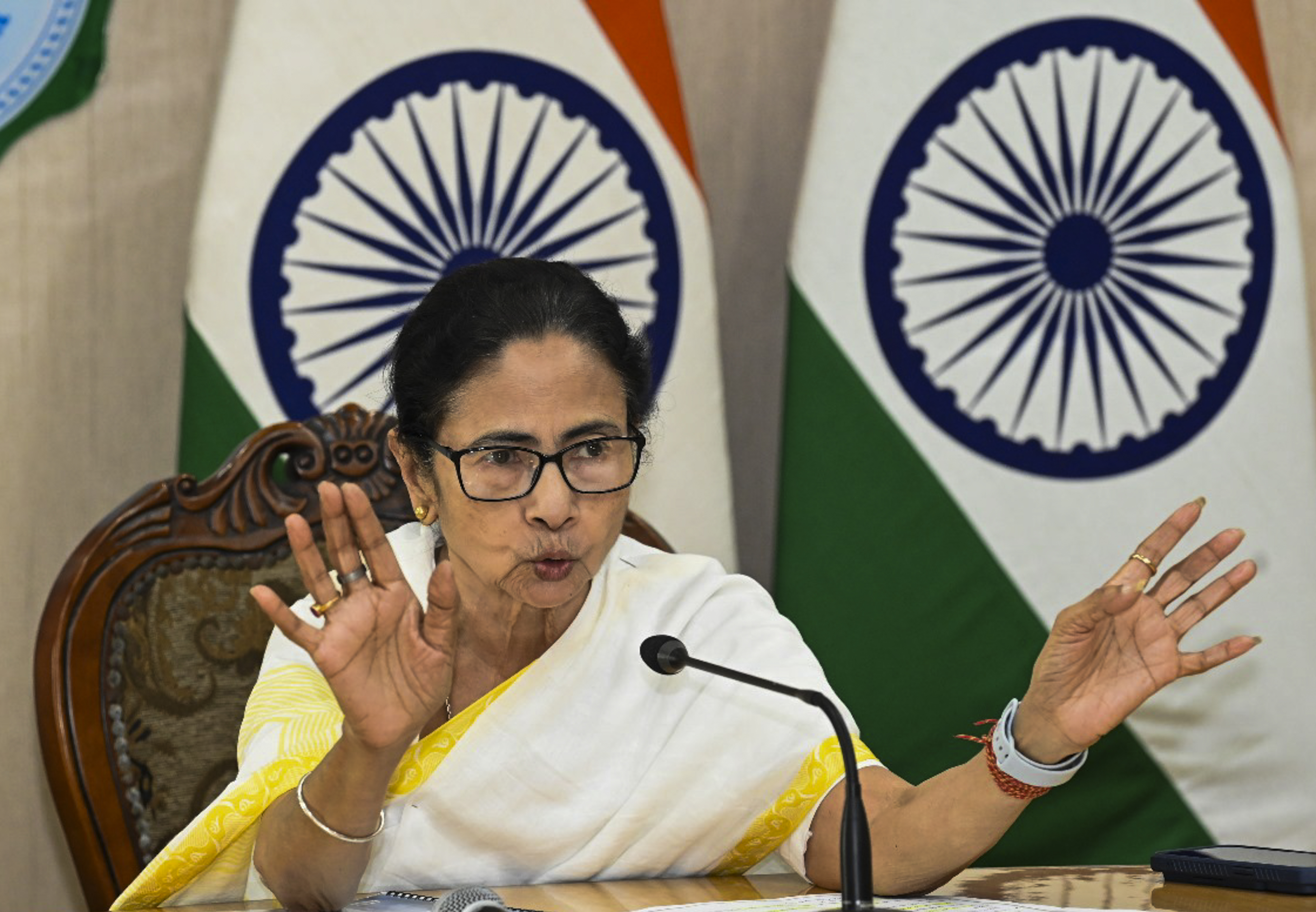 **EDS: THIRD PARTY** In this image provided by CM Office on Thursday, April 17, 2025, West Bengal CM Mamata Banerjee address a press conference in Kolkata. (CMO via PTI Photo)(PTI04_17_2025_000297B)