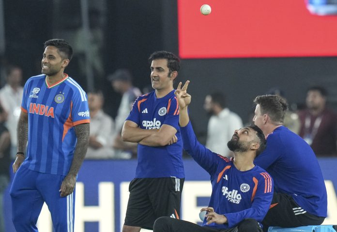 Ahmedabad: From left, India's captain Suryakumar Yadav, coach Gautam Gambhir and Varun Chakravarthy during a training session on the eve of the ICC Men's T20 World Cup 2026 final cricket match between India and New Zealand, at the Narendra Modi Stadium in Ahmedabad, Gujarat, Saturday, March 7, 2026. (PTI Photo/Shailendra Bhojak)(PTI03_07_2026_000375B)