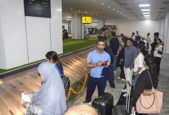 Bhopal: Passengers wait for their luggage at the Raja Bhoj Airport, in Bhopal, Madhya Pradesh, Sunday, March 29, 2026. Union Civil Aviation Minister K Ram Mohan Naidu on Sunday e-inaugurated key passenger facilities, including a domestic arrival hall and a fire station, at the airport. (PTI Photo) (PTI03_29_2026_000333B)
