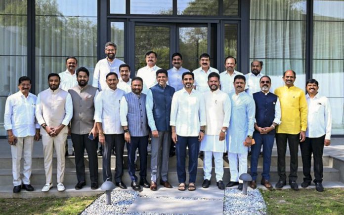 **EDS: THIRD PARTY IMAGE; WITH STORY** In this image received on April 2, 2026, Union Minister Kinjarapu Ram Mohan Naidu, MoS Chandra S Pemmasani, Andhra Pradesh HRD Minister Nara Lokesh, and other NDA MPs pose for photographs after a meeting, in Amaravati, Andhra Pradesh. (Handout via PTI Photo)(PTI04_02_2026_000099B)