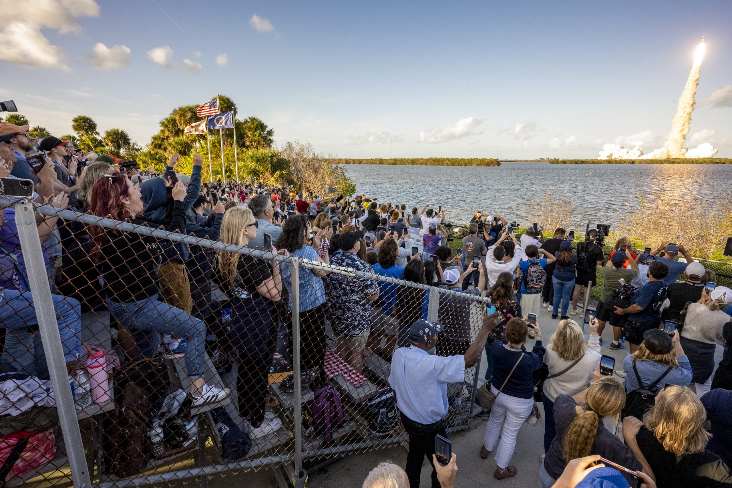 **EDS: THIRD PARTY IMAGE** In this image posted on April 2, 2026, People gather as NASA’s Space Launch System (SLS) rocket carrying the Orion spacecraft lifts off on the Artemis II mission from the Kennedy Space Center, in Cape Canaveral, Florida. (@nasahqphoto/X via PTI Photo)(PTI04_02_2026_000027B)