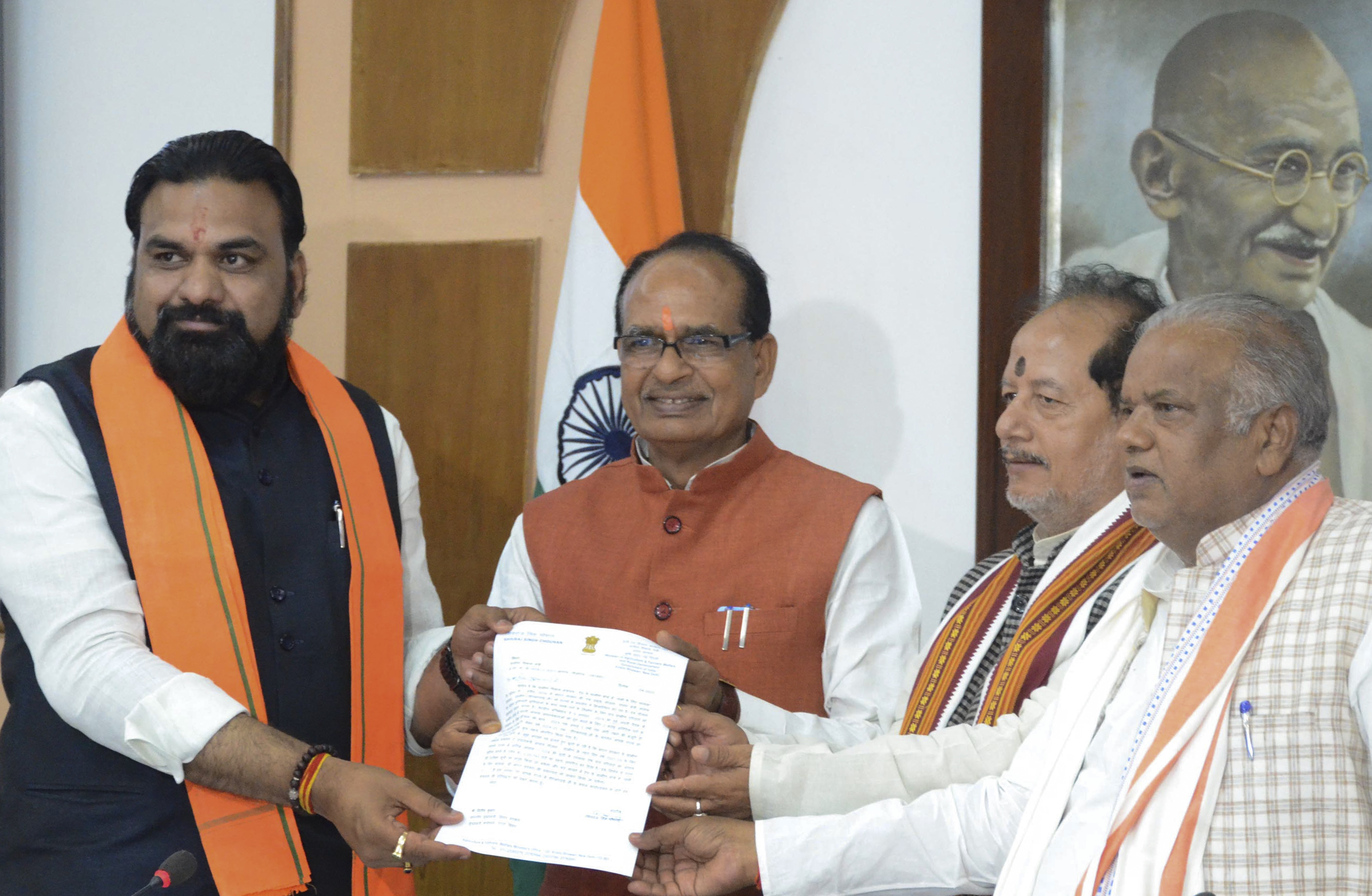 Patna: Bihar Deputy CMs Samrat Chaudhary and Vijay Kumar SInha give a memorandum to Union Minister of Agriculture Shivraj Singh Chouhan during National Panchayati Raj Day meeting, in Patna, Saturday, April 12, 2025. (PTI Photo) (PTI04_12_2025_000300B)
