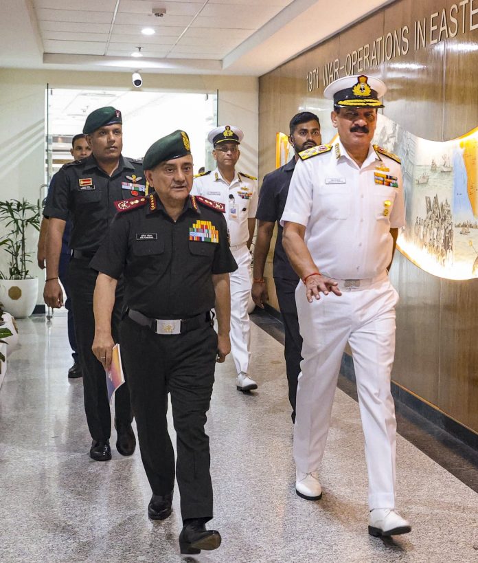**EDS: THIRD PARTY IMAGE** In this image released by Defence PRO on April 11, 2025, Chief of Defence Staff General Anil Chauhan and Chief of the Naval Staff Admiral Dinesh K Tripathi during the Naval Commanders’ Conference 2025, in New Delhi. (Defence PRO via PTI Photo)(PTI04_11_2025_000634B)