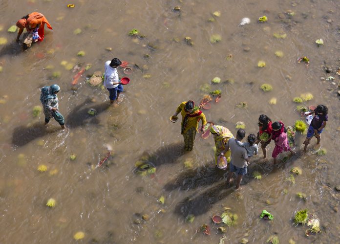 Jammu: People use barley saplings as part of a ritual on the last day of the ‘Navaratri’ festival, at the Tawi river in Jammu, Friday, March 27, 2026. (PTI Photo)(PTI03_27_2026_000163B)