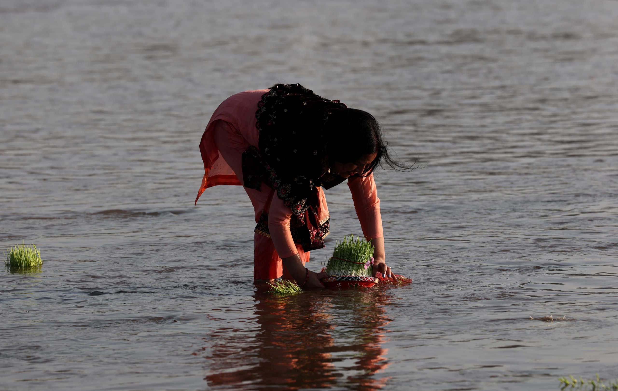 Jammu: A woman uses barley saplings as part of a ritual on the last day of the ‘Navaratri’ festival, at the Tawi river in Jammu, Friday, March 27, 2026. (PTI Photo)(PTI03_27_2026_000015B)