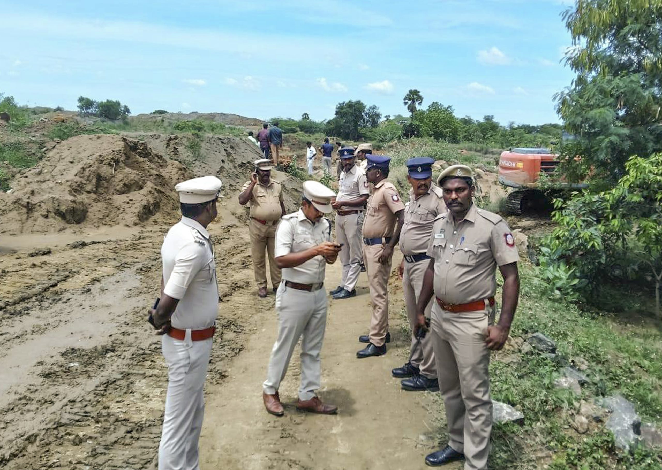 Sivaganga: Police personnel stand near the stone quarry in Mallakottai where five workers were killed in a rockslide, in Sivaganga district, Tuesday, May 20, 2025. (PTI Photo) (PTI05_20_2025_000288B)