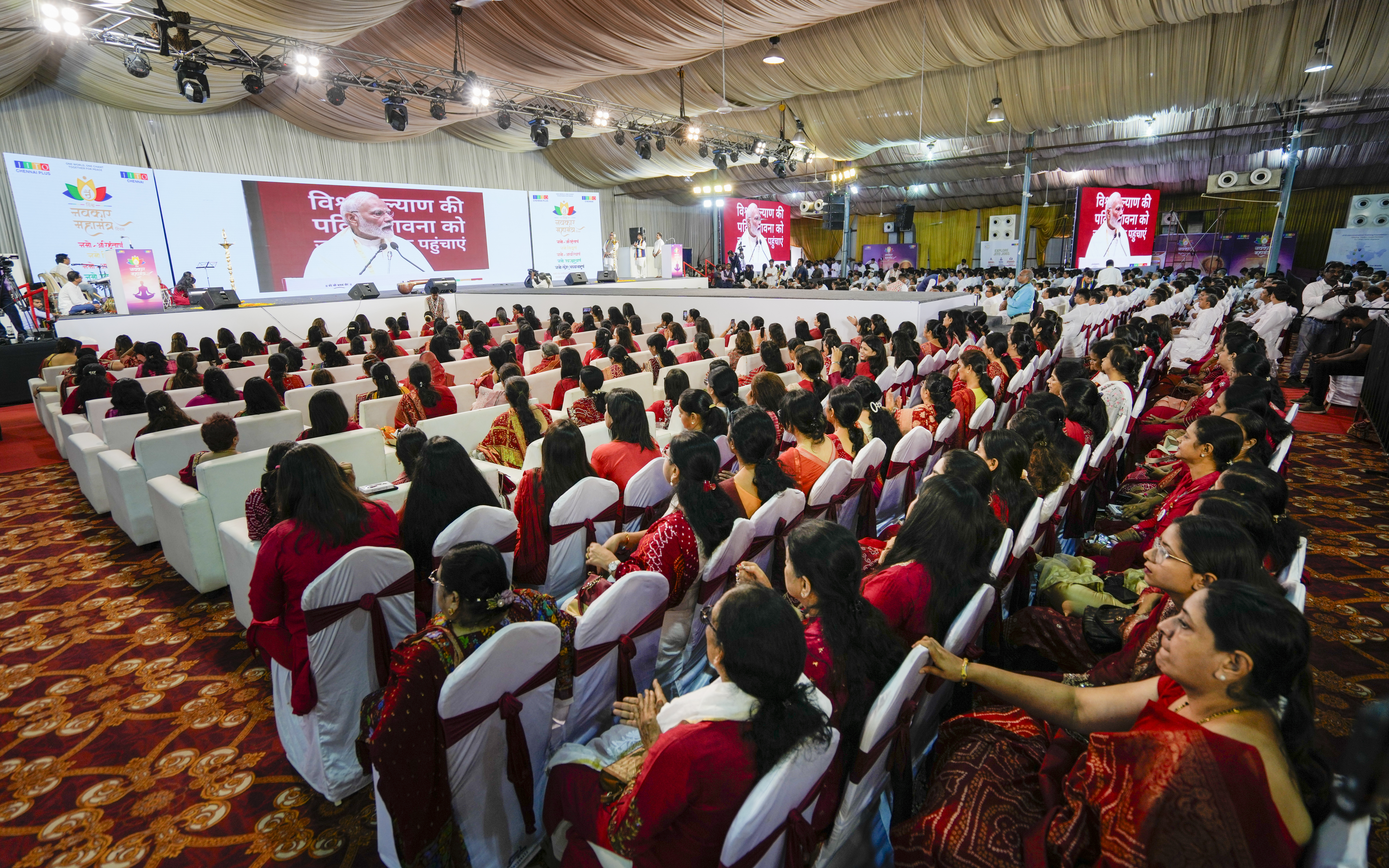 Chennai: People from Jain community chant ‘Navkar Mahamantra’ for “world unity and peace” at an event organised on the Navkar Mahamantra Divas, in Chennai, Wednesday, April 9, 2025. Prime Minister Narendra Modi virtually inaugurated the event from New Delhi as the Divas is being observed across 108 countries. (PTI Photo/R Senthilkumar) (PTI04_09_2025_000124B)