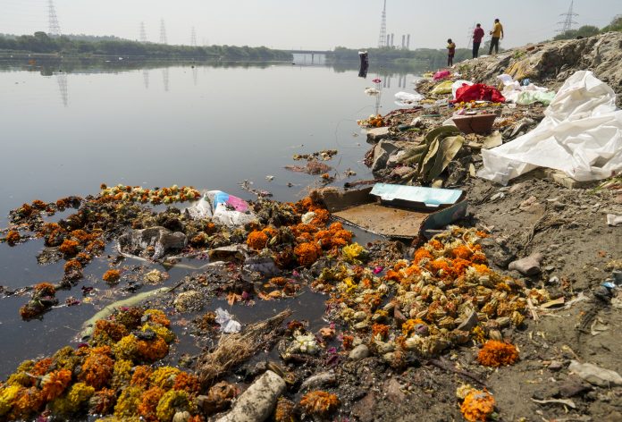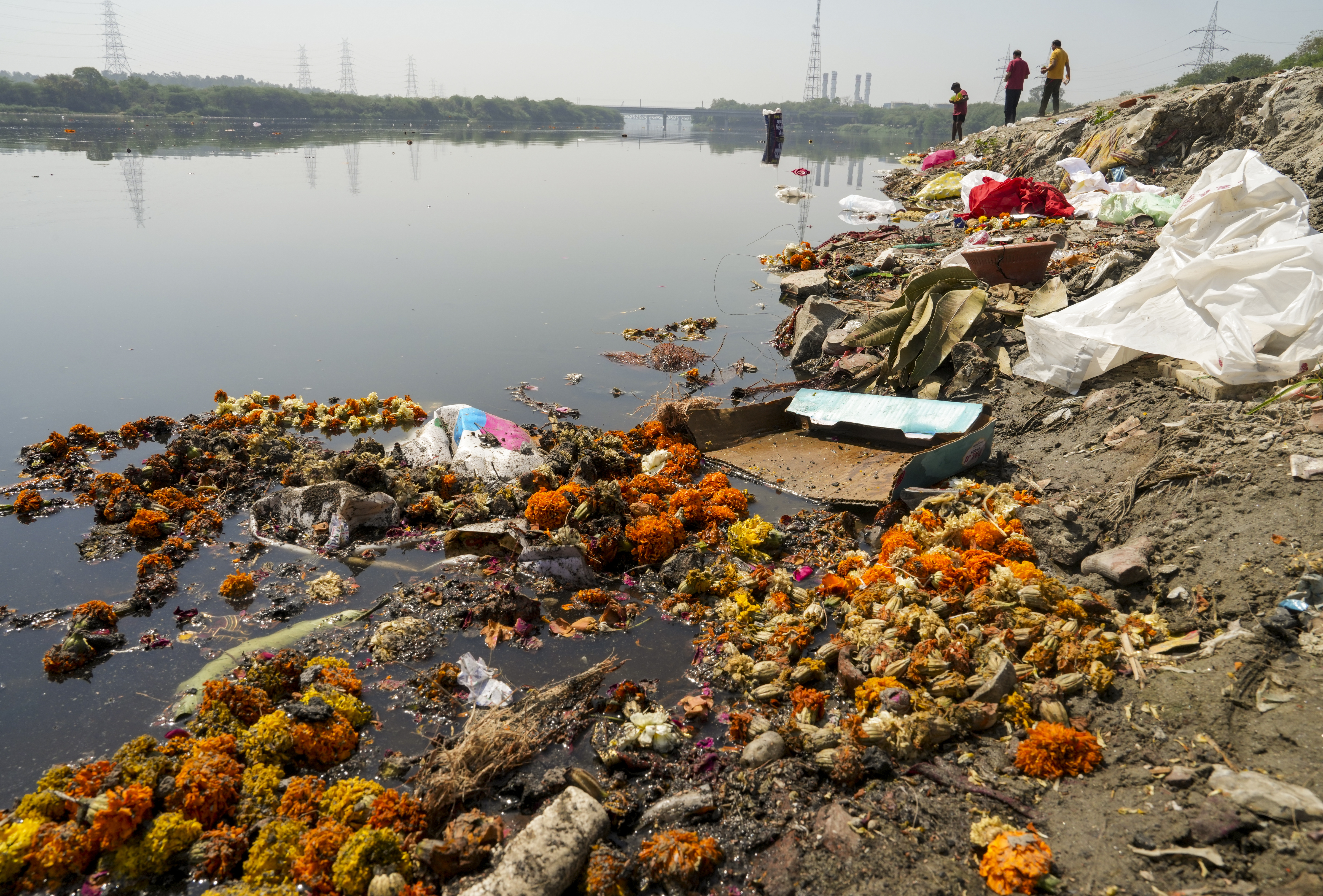 New Delhi: Flowers and other material used for prayers and rituals accumulate on the banks of the Yamuna river, on the last day of the �Chaitra Navratri� festival, at ITO, in New Delhi, Sunday, April 6, 2025. (PTI Photo/Manvender Vashist Lav) (PTI04_06_2025_000122B)